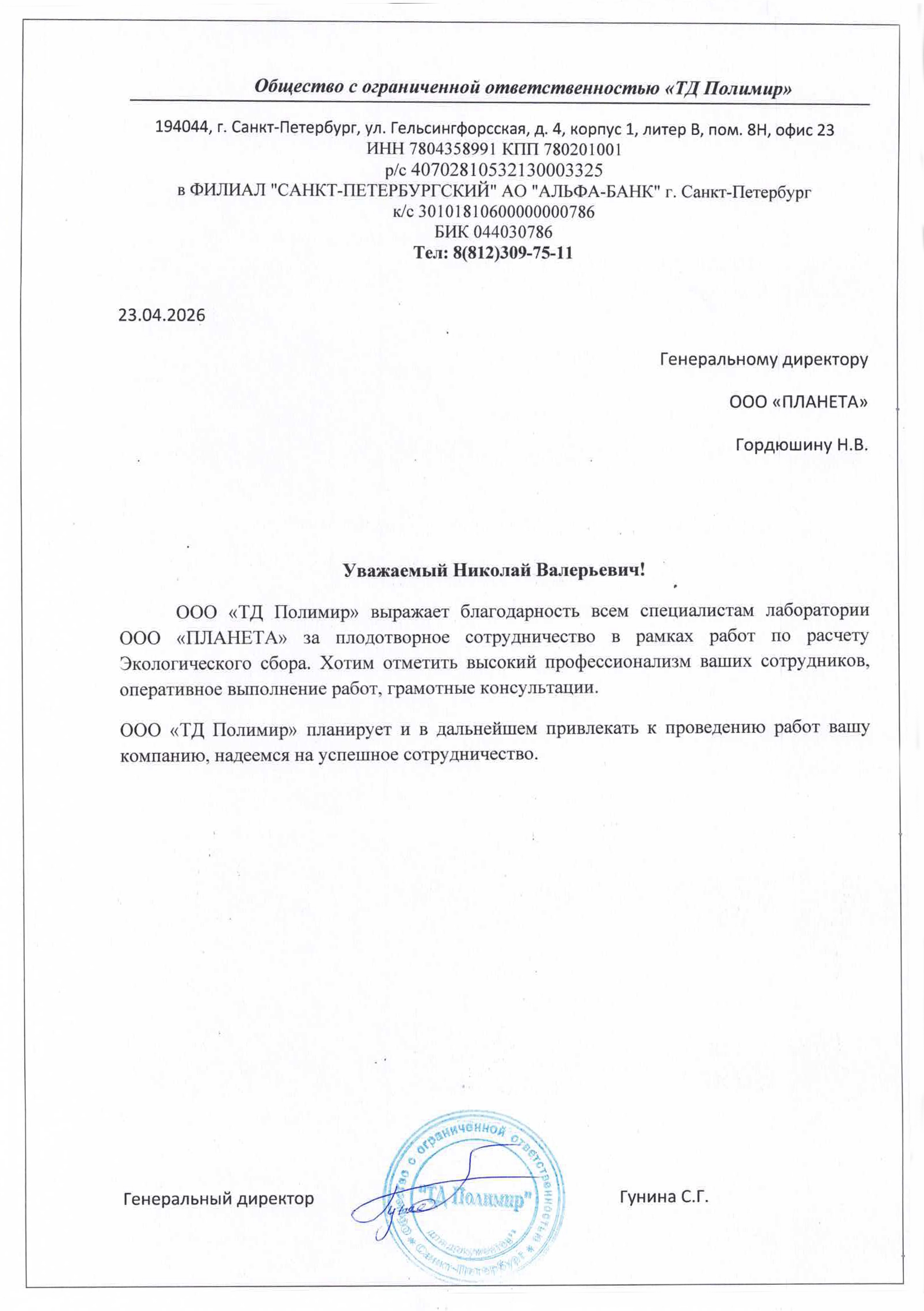Отзыв от ООО "ТД Полимир" (РОП - экологический сбор)