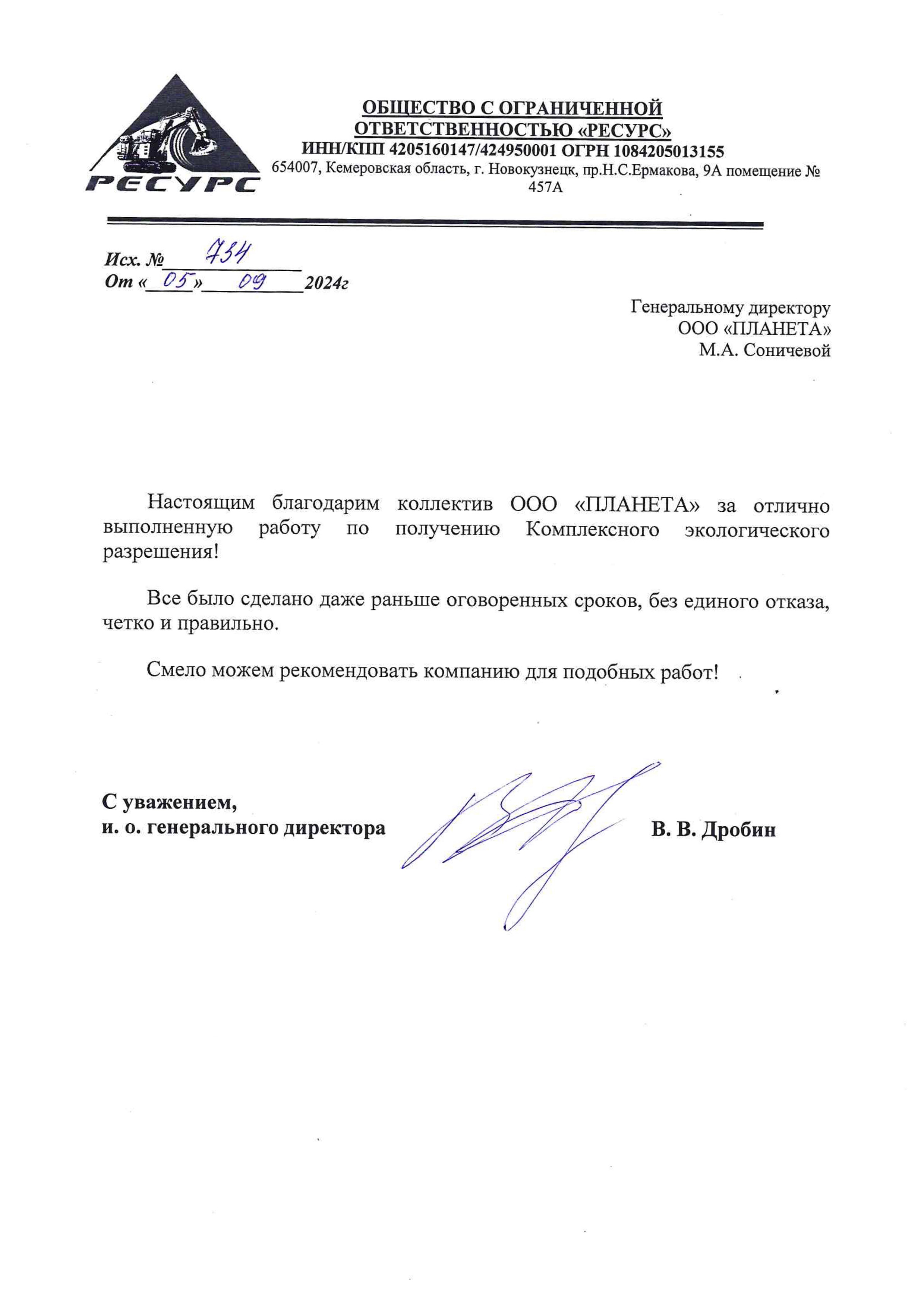 Отзыв от ООО "РЕСУРС" (КЭР)