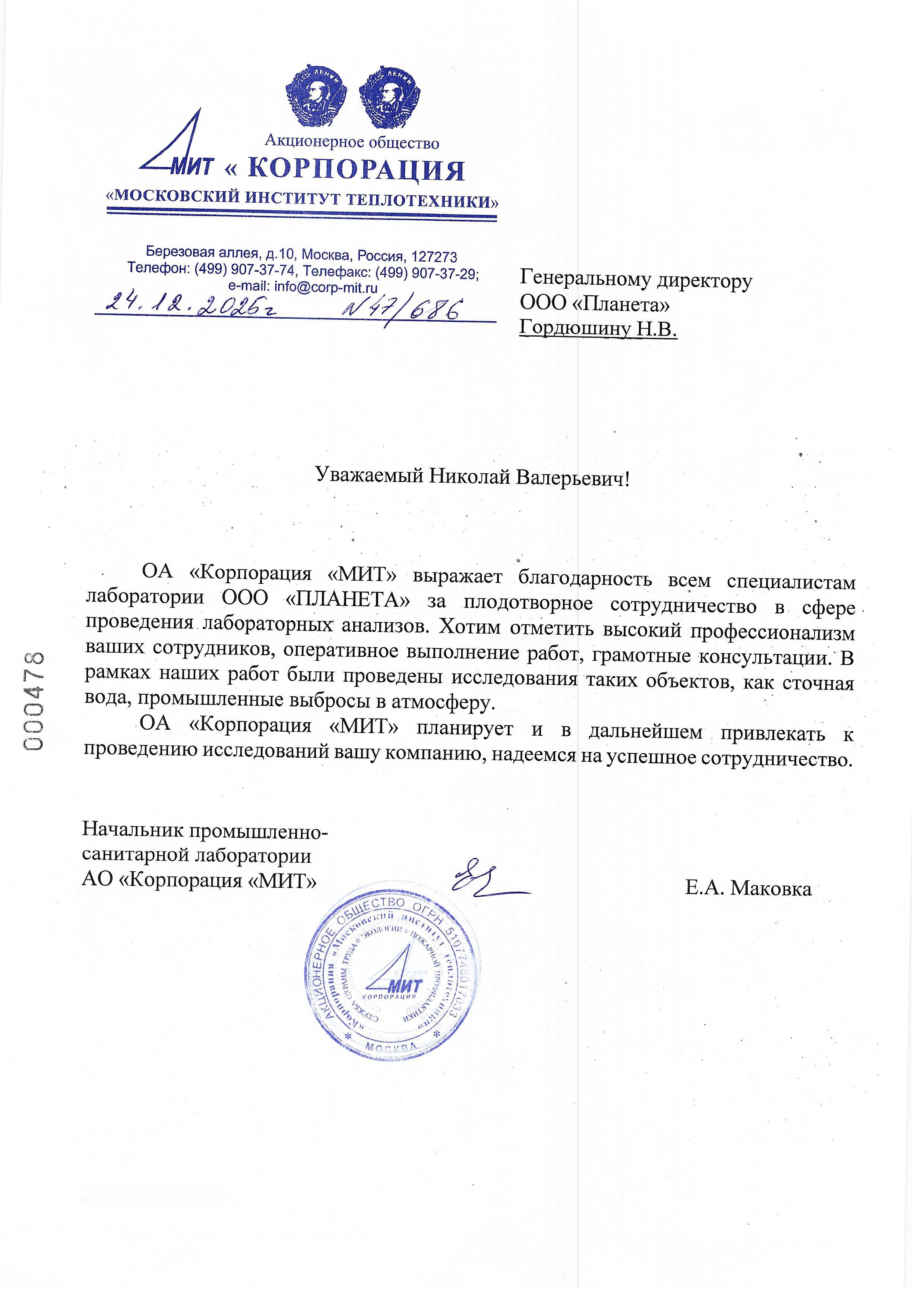 Отзыв от АО "Корпорация МИТ" (лабораторные анализы)