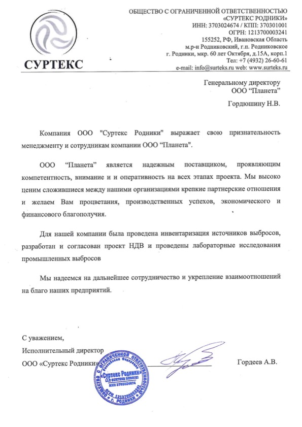 Отзыв от ООО "Суртекс Родники" (инвентаризация источников выбросов, НДВ, исследования промвыбросов)